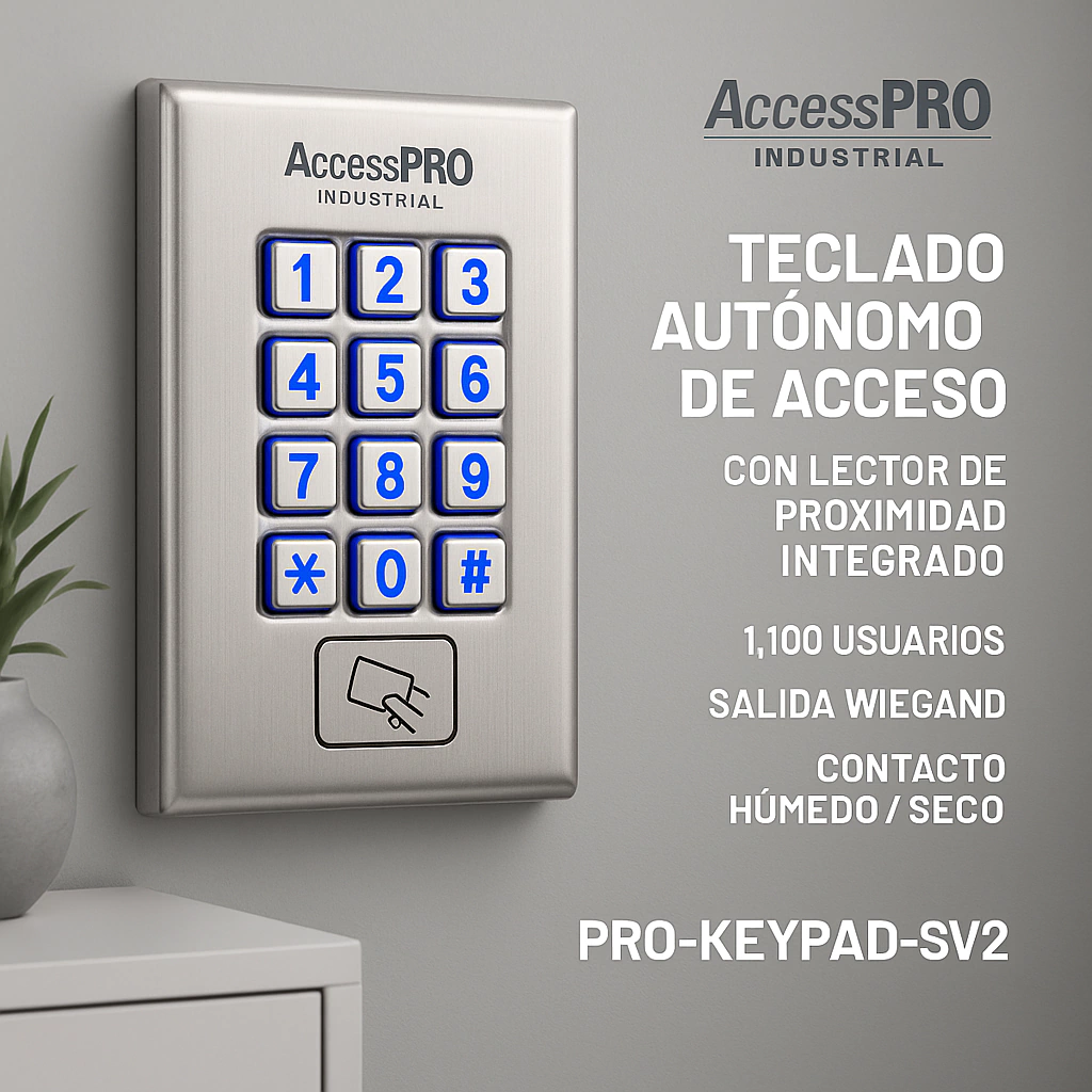 El PRO-KEYPAD-SV2 es un teclado autónomo de control de acceso con lector de proximidad integrado, diseñado para uso interior en entornos industriales o residenciales que requieren alta confiabilidad y seguridad. Su estructura en placa de acero inoxidable garantiza durabilidad y resistencia, ideal para uso prolongado.